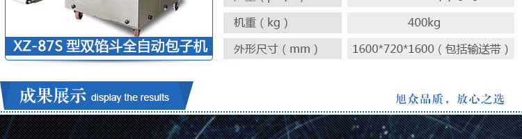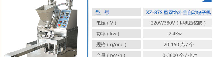 XZ-87S型雙餡斗全自動(dòng)包子機(jī),可生產(chǎn)各種肉包、肉菜包、菜包、小籠包、湯包、水晶包、圓饅頭、奶黃包、豆沙包、叉燒包、南瓜餅等幾十種包餡制品。適用于賓館、飯店、學(xué)校、機(jī)關(guān)企業(yè)食堂、饅頭或包子加工廠、早餐工程店及速凍食品廠等單位。可滿足不同客戶群體。免費(fèi)提供工藝技術(shù)。免費(fèi)上門培訓(xùn)指導(dǎo)安裝。