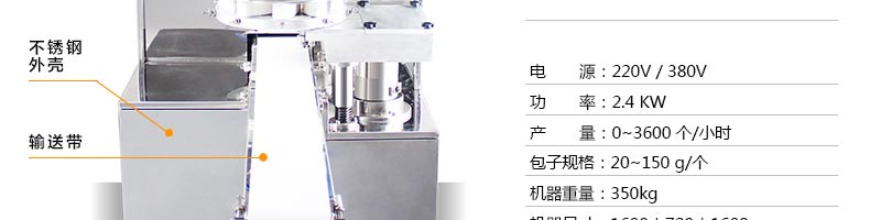 名稱XZ-86型全自動包子機 電源220/380V(見機器名牌) 功率2.4kw 產(chǎn)量0-3600個/小時 尺寸1600*720*1600mm(包括輸送帶) 重量350kg 規(guī)格20-150克/個 其他