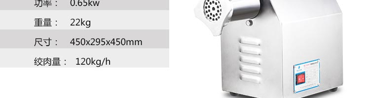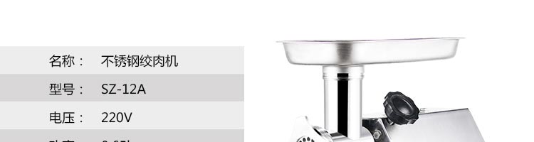 名稱SZ-12A 絞肉機(jī) 電源220v 功率0.65kw 產(chǎn)量120kg 尺寸450*295*450mm 重量22kg 規(guī)格 其他