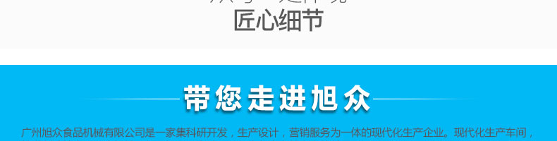 廣州旭眾食品機(jī)械有限公司是一家集科研開發(fā),生產(chǎn)設(shè)計(jì),營(yíng)銷服務(wù)為一體的現(xiàn)代化生產(chǎn)企業(yè)。現(xiàn)代化生產(chǎn)車間,精湛制造技術(shù),所產(chǎn)機(jī)械歷經(jīng)市場(chǎng)重重考驗(yàn),不斷贏得海內(nèi)外客戶的贊譽(yù)。