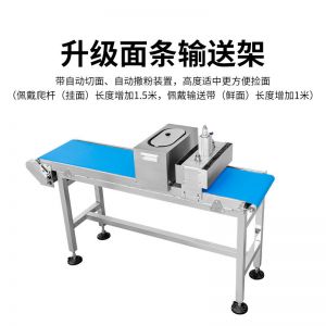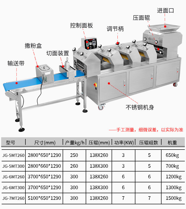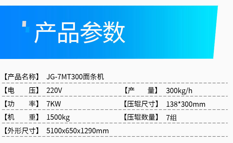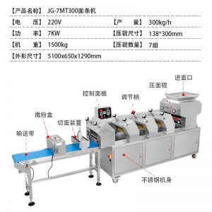 名稱JG-7MT300面條機 電源220V 功率7KW 產(chǎn)量300kg/h 尺寸5100×650X1290mm 重量1500kg 規(guī)格請資詢銷售員 其他
