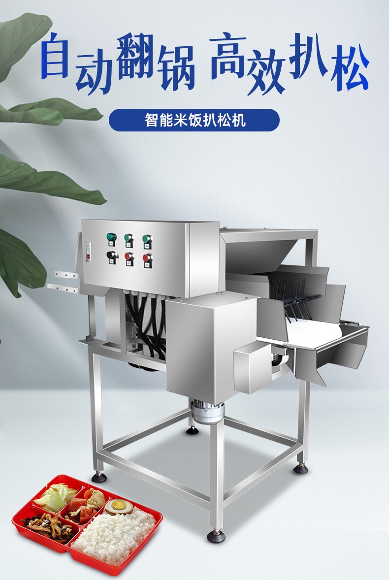 智能米飯扒松機-翻轉(zhuǎn)扒松機,主要結(jié)構(gòu):由不銹鋼機架、翻鍋機構(gòu)、扒松機構(gòu)輸送機構(gòu)和電氣自動系統(tǒng)等組成。適用對象:主要用于中央廚房、團膳、企事業(yè)單位食堂等