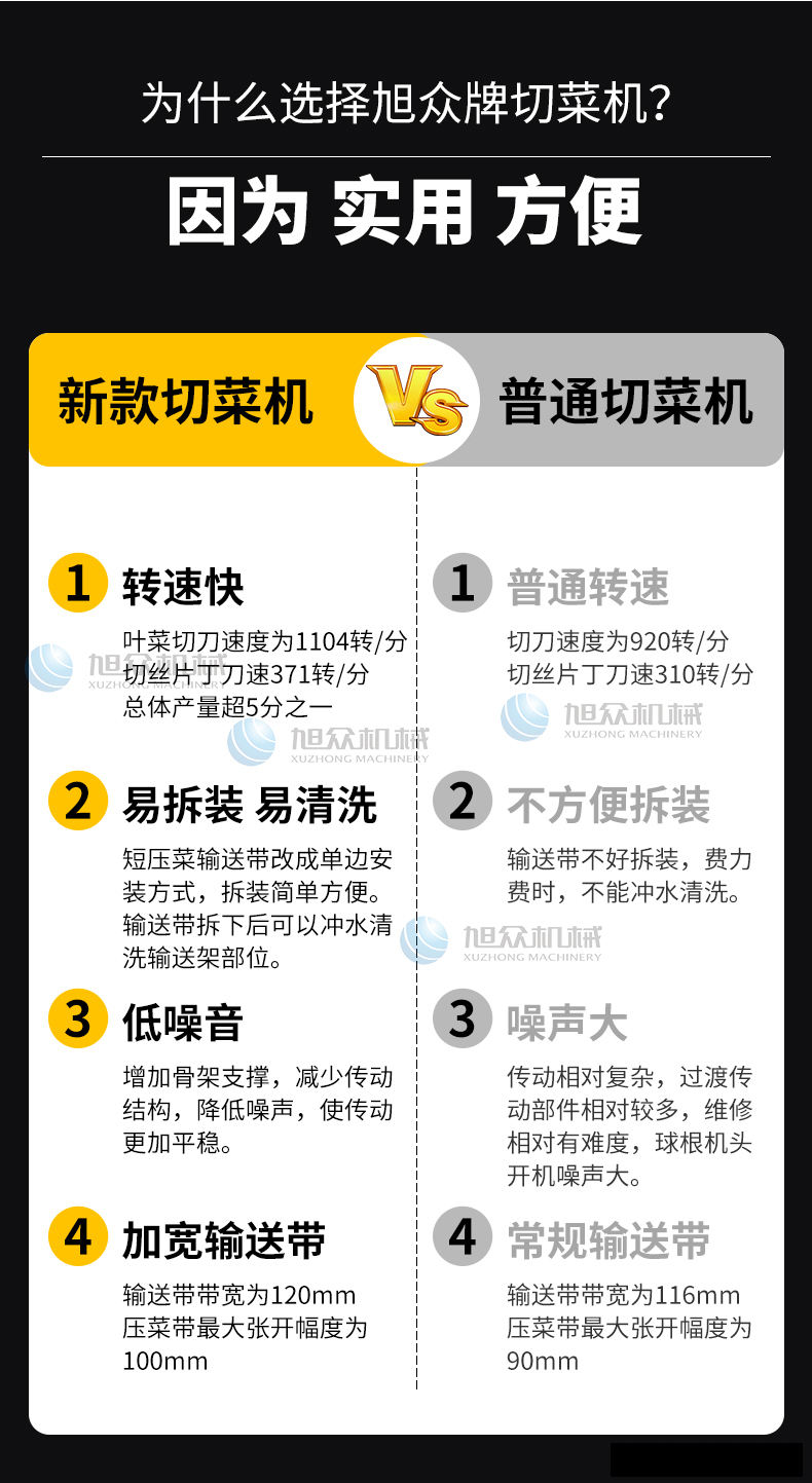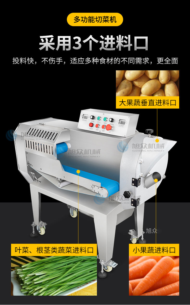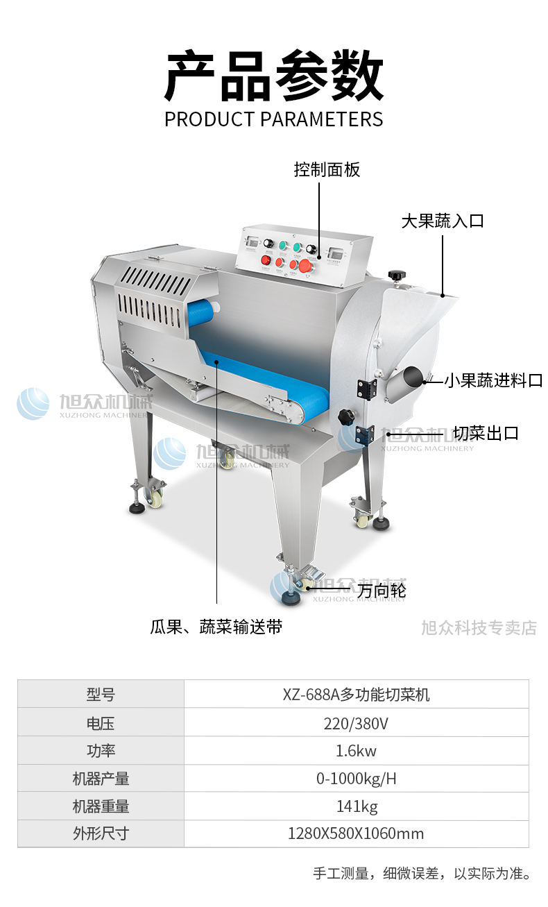 XZ-688A切菜機,占地使用面積小機器小,省空間,適合飯店、食堂、酒店等使用。省事省力省人工1小時加工2000斤葉菜切刀速度為1104轉(zhuǎn)/分,切絲、切片、切丁、刀速371轉(zhuǎn)/分。