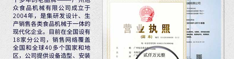 廣州旭眾食品機械有限公司是一家集科研開發(fā),生產(chǎn)設(shè)計,營銷服務為一體的現(xiàn)代化生產(chǎn)企業(yè)?,F(xiàn)代化生產(chǎn)車間,精湛制造技術(shù),所產(chǎn)機械歷經(jīng)市場重重考驗,不斷贏得海內(nèi)外客戶的贊譽。