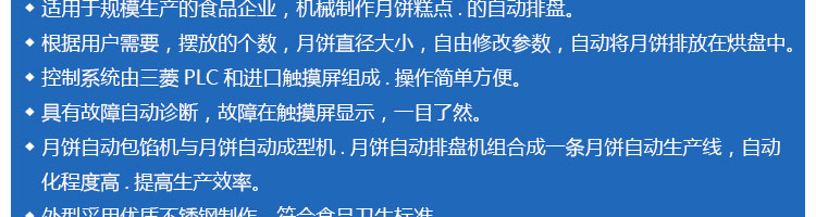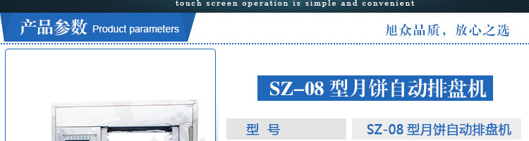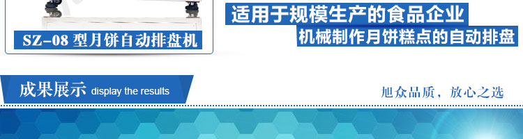 SZ-08型月餅自動(dòng)排盤機(jī),可同于制作各種月餅。適用于蛋糕房、休閑食品廠、食品加工產(chǎn)、面包房、月餅加工廠、超市、學(xué)校、食堂等各種工作場(chǎng)所??蓾M足不同客戶群體。免費(fèi)提供工藝技術(shù)。