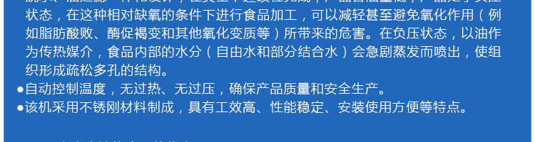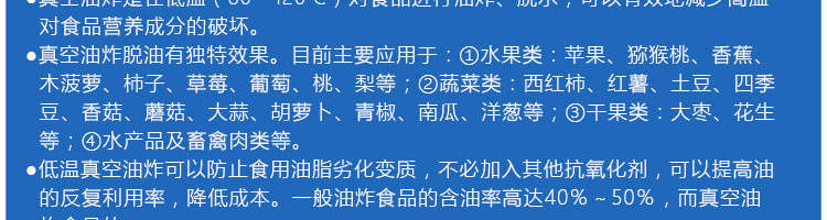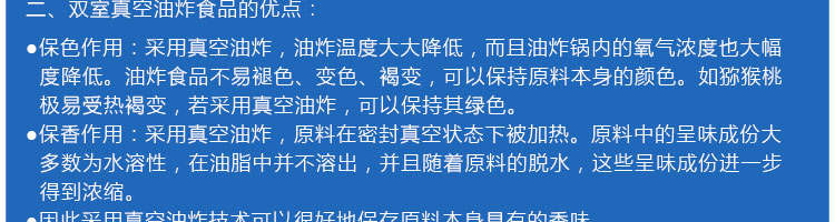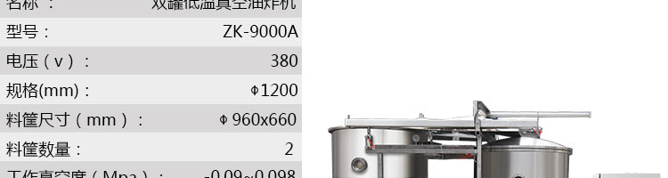 zk-1200雙罐低溫真空油炸機(jī),適用于水果類、蔬菜類、干果類、水產(chǎn)品機(jī)畜禽肉類等。油炸食品不易褪色、褐色,可以保持原料本身的顏色